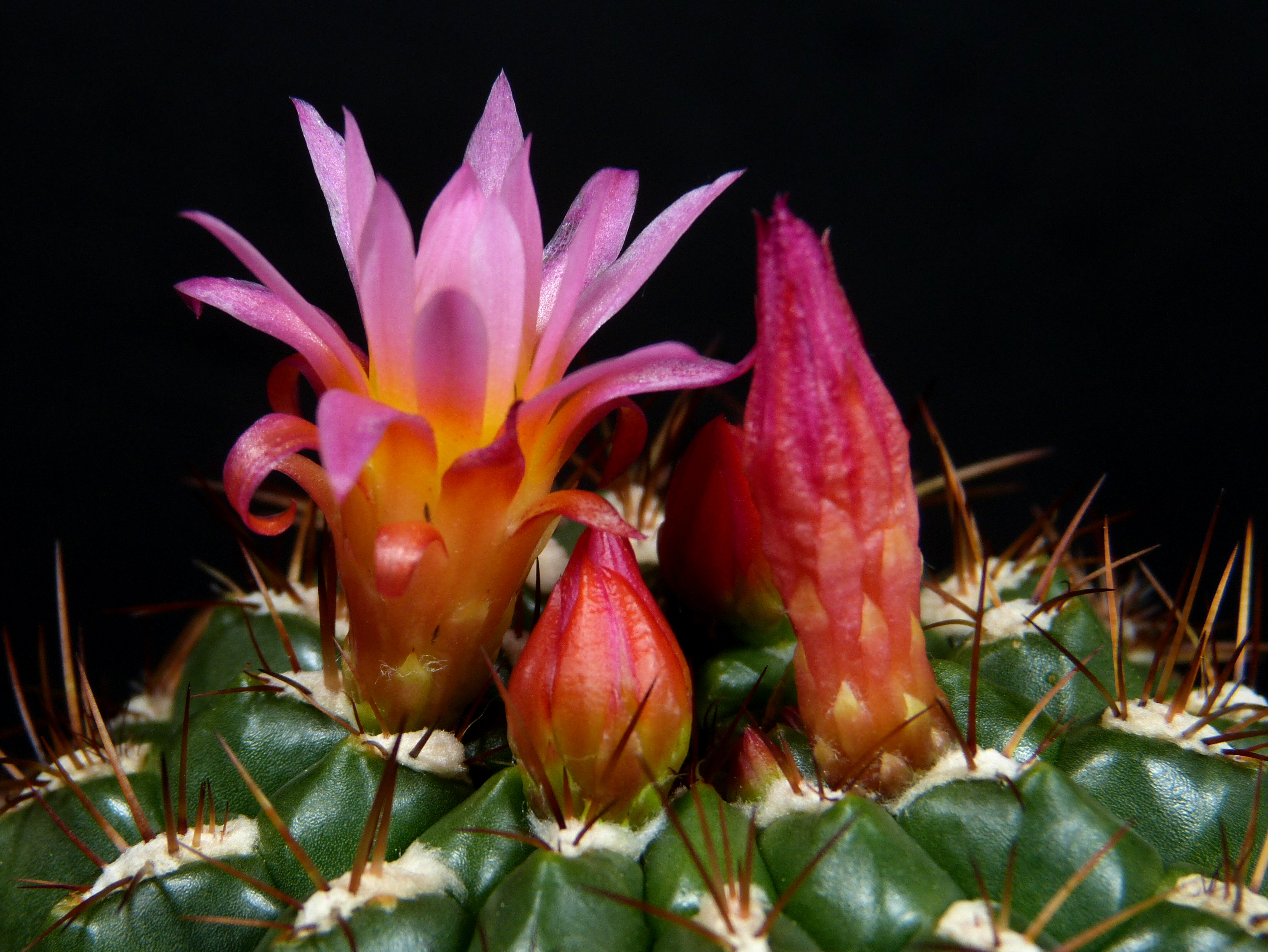The tulip-shaped flowers typical of this genus originate from the upper areoles. The single flower is not larger than 3 cm, is pink on the outside and yellow on the inside.